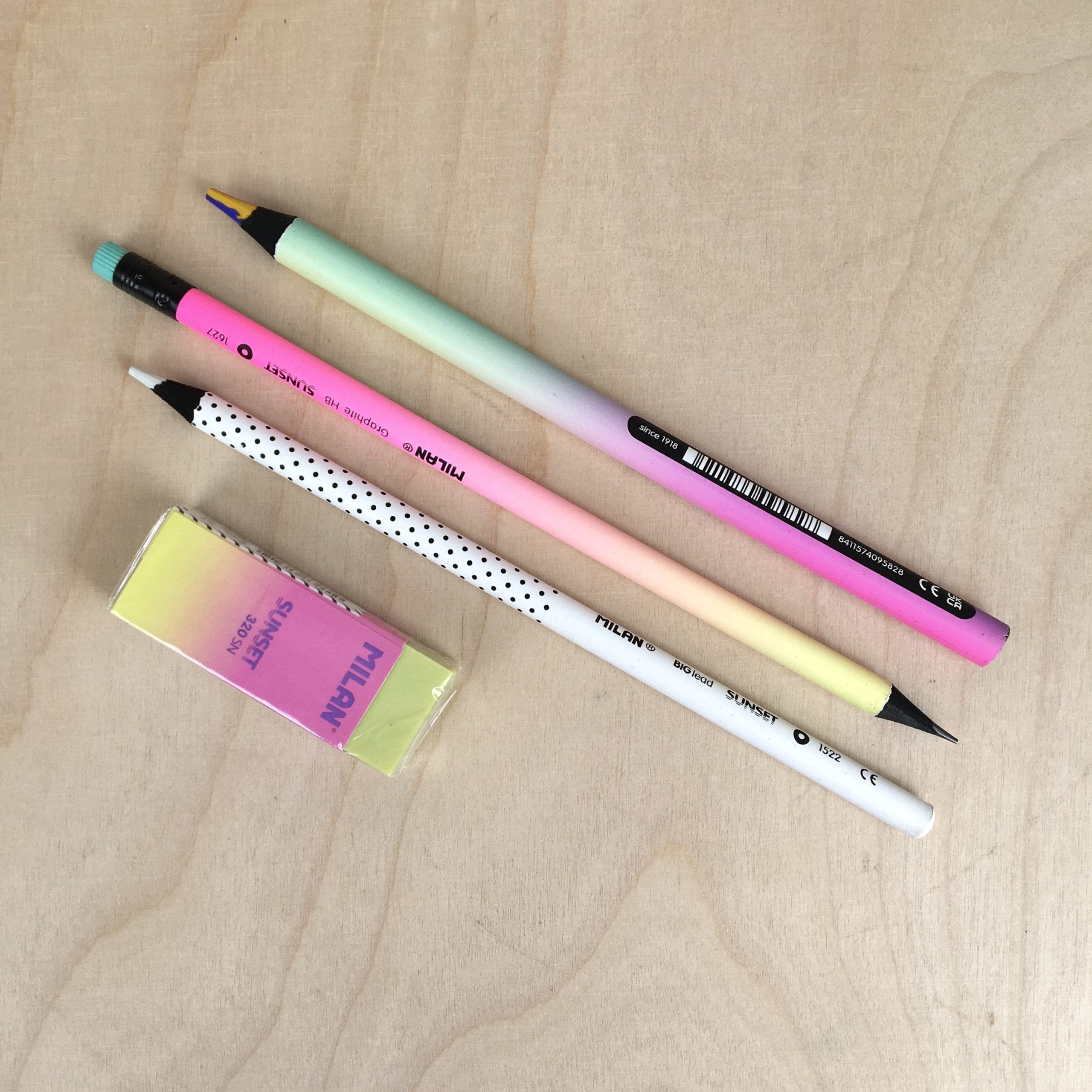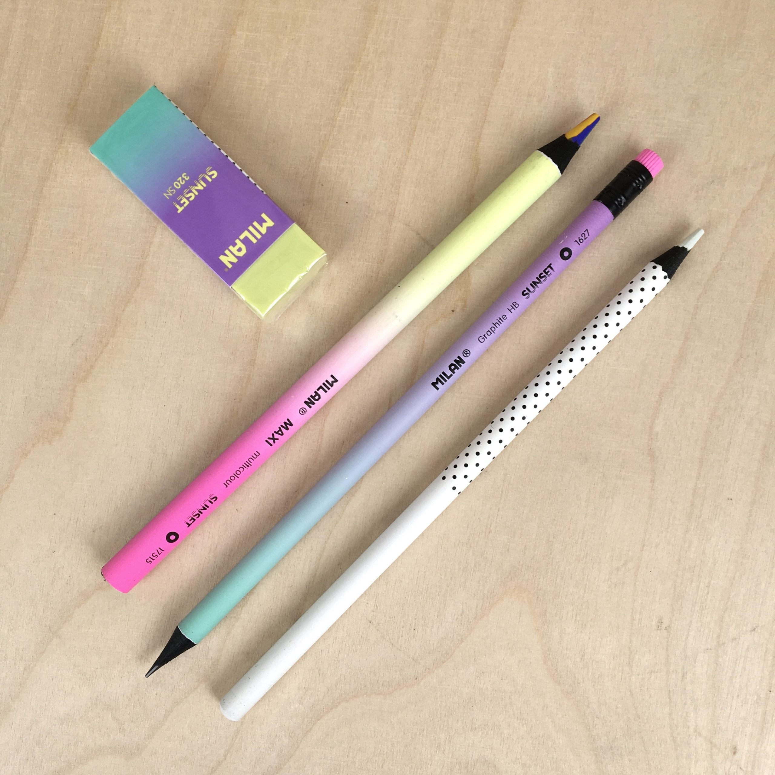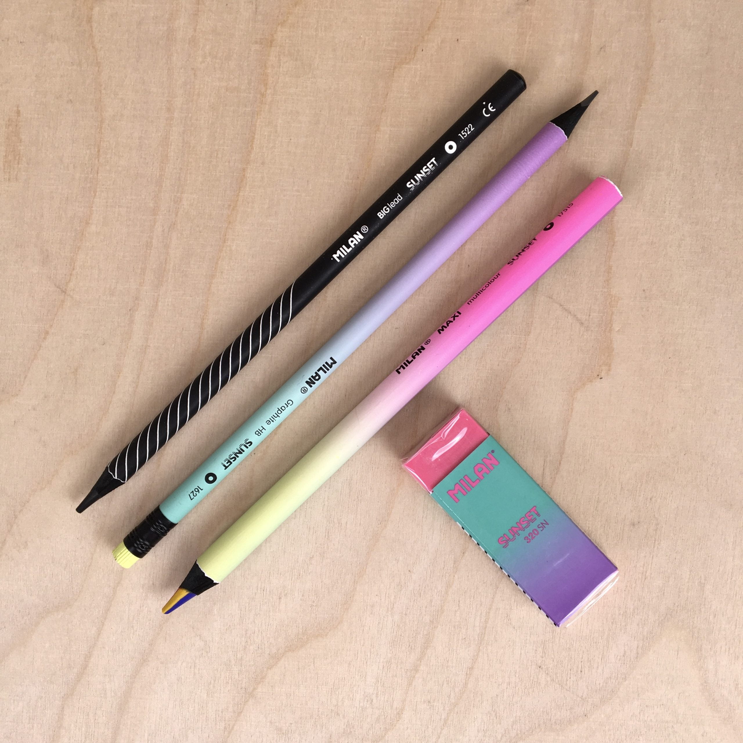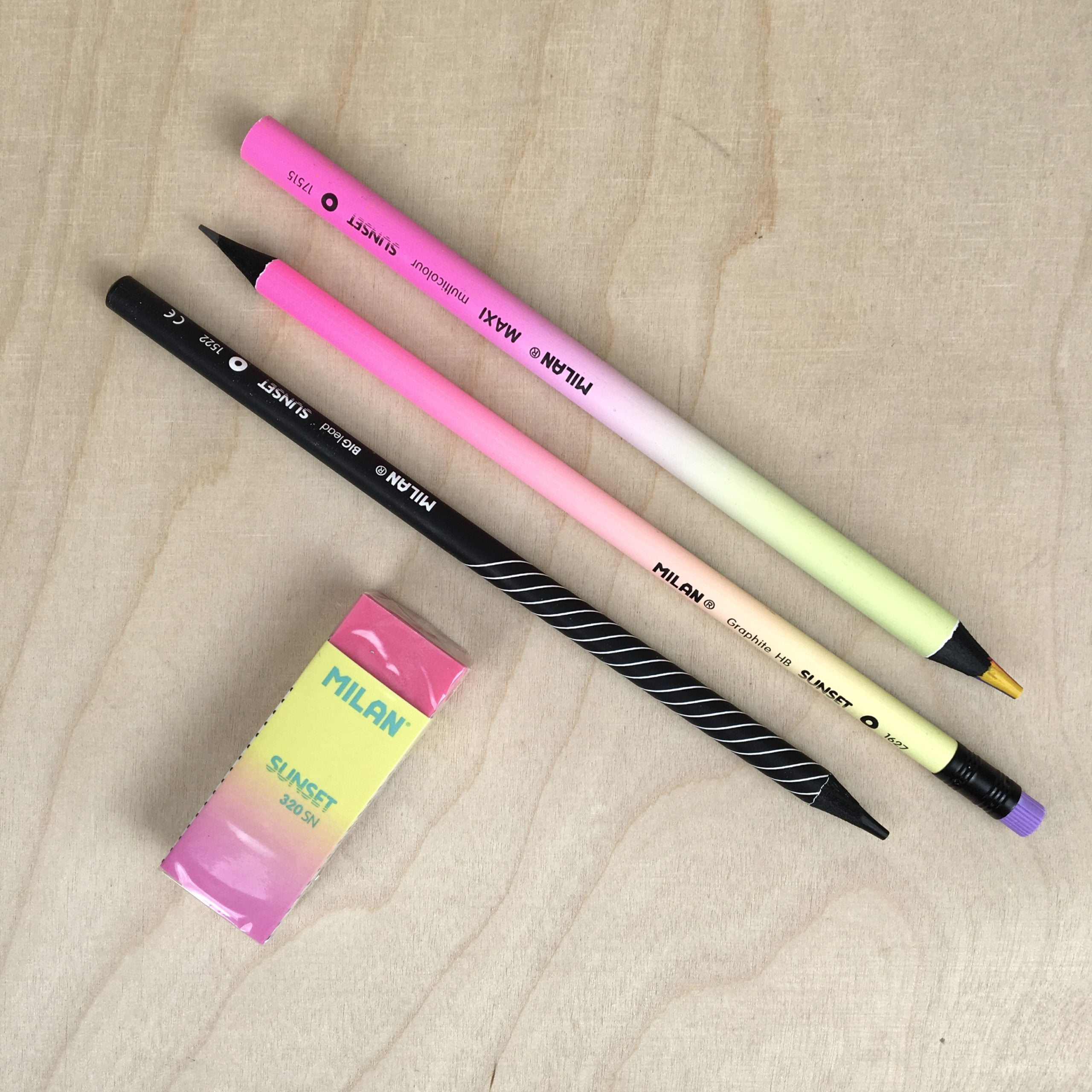 Voici un lot de 3 crayons et 1 gomme de la collection SUNSET de la marque MILAN