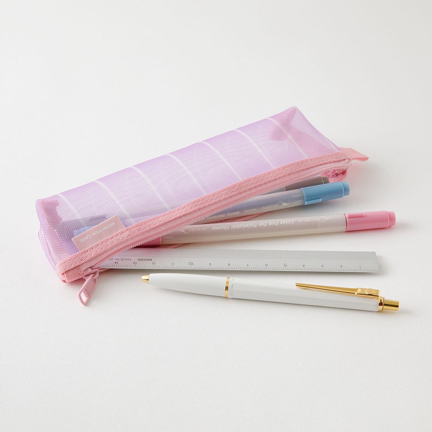 A limited-edition check & stripe design is now available for the pen case made from lightweight mesh material, making it easy to see its contents. Though compact, the gusset provides more storage space than it appears.